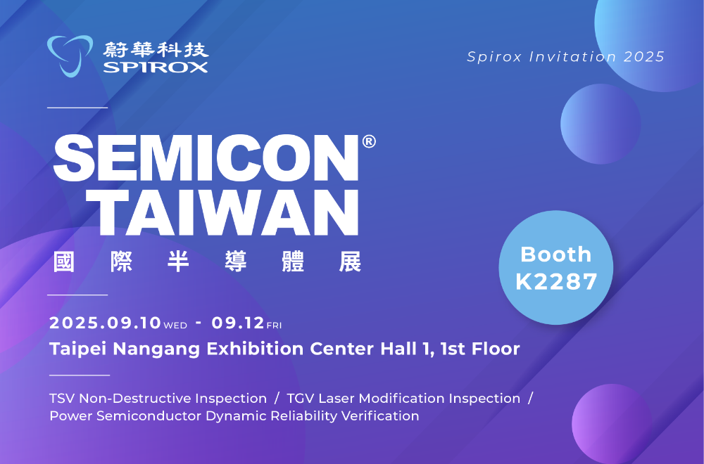 The exhibition will be held from September 10 to 12, 2025, at Taipei Nangang Exhibition Center, Halls 1 and 2, and will bring together key industry leaders and innovators from across the global semiconductor supply chain. At Hall 1, Spirox will showcase advanced equipment and technologies for non-destructive TSV inspection, TGV laser modification inspection, and power semiconductor dynamic reliability verification. Our technologies empower manufacturers to precisely monitor process quality and enhance yield and production efficiency.