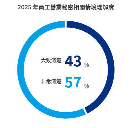 為提升員工對營業秘密保護之認知與資訊保密意識,人力資源處於 2025 年 9 月 辦理營業秘密宣導教育訓練,透過影片教材及情境案例說明營業秘密外洩風險,並搭配測驗與問卷調查方式,了解員工對營業秘密保護制度之認知與滿意度,作為後續教育訓練與制度優化之參考依據。本項調查由人力資源處負責辦理,並配合宣導活動不定期實施。