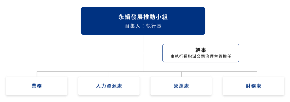 蔚華科技於 2024 年 2 月 5 日成立跨單位(業務、人力資源處、營運處、財務處、公司治理)的 「永續發展推動小組」作為公司內部最高階的永續發展專責組織。小組由執行長擔任召集人,其他成員分別為人力資源處資深協理、營運處協理、財務處資深經理、公司治理主管組成,採集團管理模式,並由召集人執行長指派小組成員公司治理主管為幹事推動相關事宜。